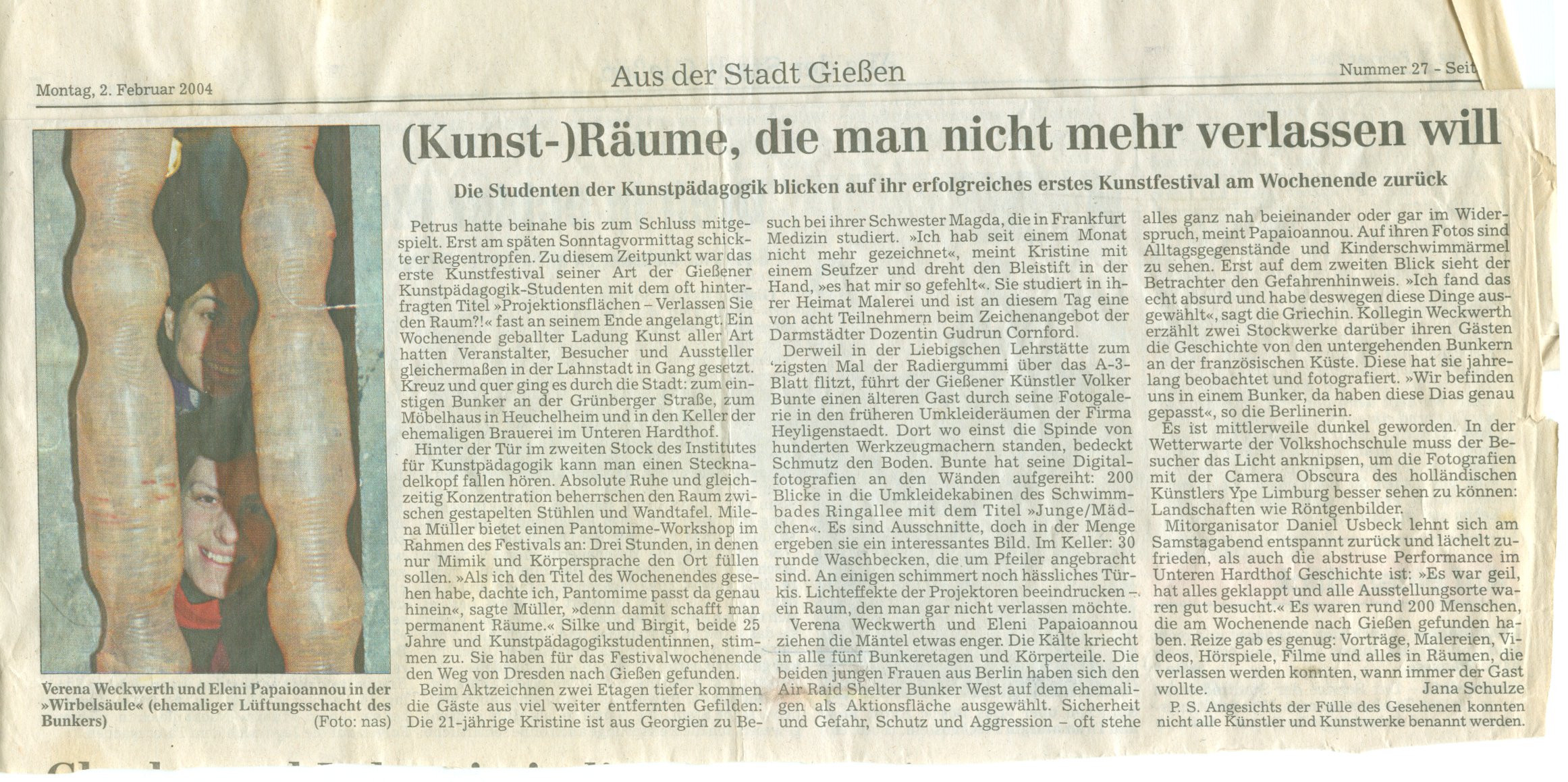 Derweil in der Liebigschen Lehrstätte zum ´zigsten Mal der Radiergummi über das A - 3 - Blatt flitzt, führt der Gießener Künstler Volker Bunte einen älteren Gast durch seine Fotogalerie in den früheren Umkleideräumender Firma Heyligenstaedt. Dort wo einst die Spinde von hunderten Werkzeugmachern standen, bedeckt Schmutz den Boden. Bunte hat seine Digitalfotografien an den Wänden aufgereiht: 200 Blicke in die Umkleidekabinen des Schwimmbads Ringallee mit dem Titel "Junge / Mädchen". Es sind Ausschnitte, doch in der Menge ergeben sie ein interessantes Bild. Im Keller: 30 runde Waschbecken, die um Pfeiler angebracht sind. An einigen schimmert noch häßliches Türkis. Lichteffekte der Projektoren beeindrucken - ein Raum, den man gar nicht mehr verlassen möchte.